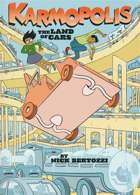 Welcome to a world on wheels! It's nonstop excitement in this nutty graphic novel starring two kids in a fast-paced future. Karmopolis is a world made up of super-highways and super-vehicles! Drivers zip from their wheeled houses to the moving super-mall without ever touching the ground, while the few mysterious Walkers skulk within the highway median. Two young Drivers, Pooja and her brother Om, are out shopping when they accidentally find a beautiful gem. After two angry men demand that they hand it over, a head-spinning adventure begins-Pooja and Om race across Karmopolis in search of the meaning of the gem, with the two creeps hot on their tailpipe. Award-winning cartoonist Nick Bertozzi combines old-fashioned comic book thrills with futuristic frenzy and super-cool diagrams in the endlessly imaginative Karmopolis: The Land of Cars.