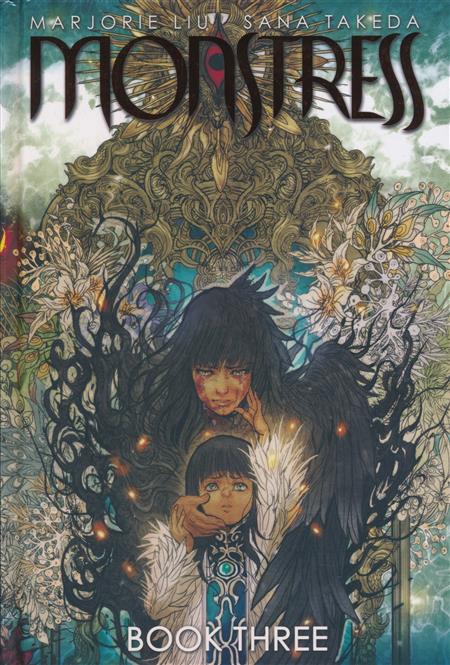 Creator/writer MARJORIE LIU and creator/artist SANA TAKEDA present a deluxe, oversized hardcover edition of their beloved breakout comic in MONSTRESS BOOK THREE. Humans and hybrid Arcanics are at war once again, but battles of the heart and soul are the most dangerous of all. Caught in the calculating grip of the Dusk Court, Maika and Zinn uncover painful secrets of the past while Tuya fights to preserve her future—and young Kippa represents the only hope for the present. MONSTRESS, BOOK THREE takes readers beyond the Known World to remote islands and an even more remote planet as our heroes finally find answers to some of their greatest mysteries. Collecting volumes 7-9 (issues #36-54) of the Eisner, Hugo, Harvey & British Fantasy Award-winning series by MARJORIE LIU and SANA TAKEDA, this deluxe, oversized hardcover brimming with more than 500 pages of art deco beauty and steampunk horror will make an elegant addition to any fan's shelf.