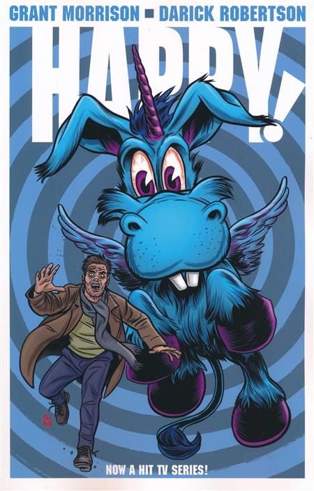 The bestselling comic that inspired the cult-favorite SYFY series follows an ex-cop at rock bottom who finds an unlikely shot at redemption when he’s guided by a tiny, relentlessly optimistic blue cartoon horse only he can see. Meet Nick Sax: a corrupt, intoxicated ex-cop turned hitman, adrift in a stinking twilight world of casual murder, soulless sex, eczema, and betrayal. With a hit gone wrong, a bullet in his side, the cops and the mob on his tail, and a monstrous child killer in a Santa suit on the loose, Nick and his world will be changed forever this Christmas by a tiny blue horse called Happy… This deluxe edition of HAPPY! includes 10 extra pages of story by creators GRANT MORRISON (NAMELESS, Arkham Asylum, Invisibles) and DARICK ROBERTSON (The Boys, OLIVER, Transmetropolitan) and was the inspiration for the TWO SEASON SYFY adaptation starring CHRIS MELONI (Law & Order: SVU) as NICK SAX and PATTON OSWALT (Ratatouille) as the voice of Happy, the imaginary blue-winged horse. Collects HAPPY! #1-4.