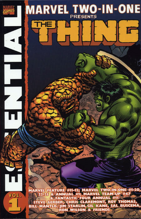 Written by LEN WEIN, MIKE FRIEDRICH, STEVE GERBER, CHRIS CLAREMONT, ROY THOMAS, BILL MANTLO, ROGER SLIFER, MARV WOLFMAN, SCOTT EDELMAN, TONY ISABELLA & JIM SHOOTER. Penciled by JIM STARLIN, GIL KANE, SAL BUSCEMA, GEORGE TUSKA, HERB TRIMPE, BOB BROWN, RON WILSON, ARVELL JONES, DICK GIORDANO, MIKE ESPOSITO, DAVE HUNT, SAM GRAINGER, MARIE SEVERIN & JOHN BUSCEMA. Cover by JIM STARLIN. The Thing can't stay out of trouble, but at least he makes friends wherever he goes! The Ever-Lovin' Idol o' Millions teams up with heroes both frontline and forgotten against menaces spanning time and space! Gods! Aliens! Spies! Demons! Dinosaurs! Time travellers! Martial artists! The Living Eraser and the Mountain That Walked Like a Man! A veritable who's who of history's horror heroes! Fans of NEW INVADERS take notice of Ben's team-ups with the Invaders AND the Liberty Legion! Collects MARVEL FEATURE #11-12; MARVEL TWO-IN-ONE #1-20, 22-25 and ANNUAL #1; MARVEL TEAM-UP #47; and FANTASTIC FOUR ANNUAL #11. 576 PGS./T+ SUGGESTED FOR TEENS AND UP.