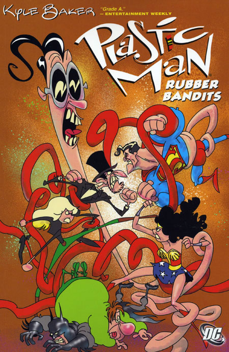 Written by Kyle Baker. Art and cover by Baker. Another volume of offbeat and hysterical Plas adventures by Harvey and Eisner Award-winning cartoonist Kyle Baker! In RUBBER BANDITS, collecting PLASTIC MAN #8-11 and #13-14, our pliable hero wrecks continuity as we know it, investigates a vampire, gets in trouble with homeland security, battles a menacing mouse, and stops one of the worst crimes ever: illegal music downloading! 144 pg, FC.