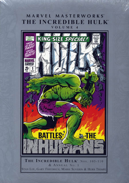 Written by GARY FRIEDRICH, STAN LEE, ROY THOMAS, BILL EVERETT & ARCHIE GOODWIN. Penciled by MARIE SEVERIN & HERB TRIMPE. Cover by JIM STERANKO. It's time for more Masterworks mayhem from the house-shakin' Hulk! Now headlining his very own title again for the first time in six years, the Green Goliath has twice the space to shake the Earth with his mighty rage, and you can bet Mighty Marvel is going to take advantage of every square inch of that space!See the beginnings of the Hulk's first outer-space adventure versus the Space Parasite! Place your bets for the strongest man-monster in the Marvel U.-ol' Greenskin or the Rhino! Then it's road-trip time! The mighty Hulk travels continents far and wide, and believe it or not, he doesn't make too many friends along the way! It's a travelogue of destruction that's going to leave the Mandarin, the Inhumans, and the entire Savage Land rubbing a sore jaw in the wake of a freight train named 'Banner.' Guest-starring Nick Fury and Ka-Zar, this baby's guaranteed to give your greenback's worth! Collecting INCREDIBLE HULK (Vol. 2) #103-110 and ANNUAL #1. 240 PGS.