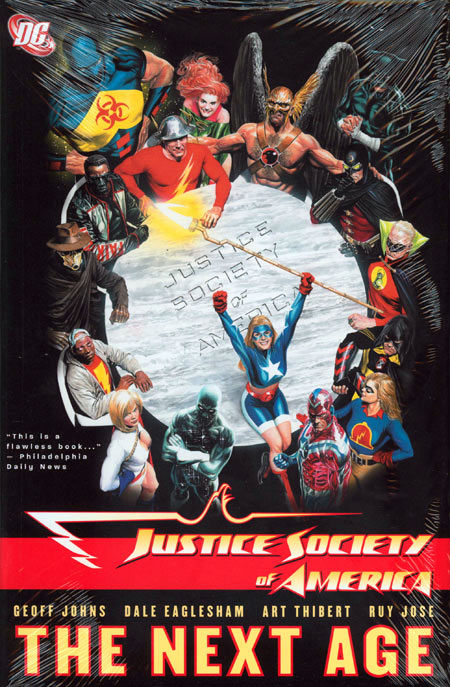 Written by Geoff Johns. Art by Dale Eaglesham, Art Thibert and Ruy Jose. Cover by Alex Ross. The world's first super-team returns in this volume collecting the first 4 issues of the all-new JUSTICE SOCIETY OF AMERICA series, written by Geoff Johns (52, GREEN LANTERN, ACTION COMICS) with stunning art by Dale Eaglesham (VILLAINS UNITED) & Art Thibert (OUTSIDERS) and a cover by Alex Ross (JUSTICE, KINGDOM COME)! Determined to rebuild the Justice Society, founding members Green Lantern, Flash and Wildcat initiate an unprecedented recruitment program, tracking the bloodlines of heroes across the world and bringing in the new Starman, Damage, Liberty Belle and more! But just as the Society welcomes the rookies into their ranks, an evil force sets out to destroy them. Meet new legacies, solve a mystery stretching into the far future, witness the return of the world's greatest hero and watch another one fall in this fantastic collection! 136 pg, FC.