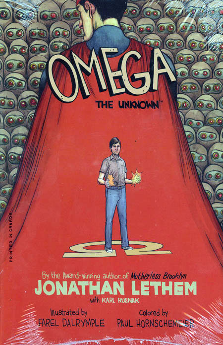 Written by JONATHAN LETHEM & KARL RUSNACK Penciled by FAREL DALRYMPLE & PAUL HORNSCHEMEIER Cover by FAREL DALRYMPLE & PAUL HORNSCHEMEIER The story of a mute, reluctant super hero from another planet, and the earthly teenager with whom he shares a strange destiny - and the legion of robots and nanoviruses that have been sent from afar to hunt the two of them down. Created in 1975 by Steve Gerber and Mary Skrenes, the original Omega the Unknown lasted only ten issues, but was a legend to those who recall it - an ahead-of-its-time tale of an anti-hero, inflected with brilliant ambiguity. One of Omega's teenage fans was award-winning novelist Jonathan Lethem, who has used the original as a springboard for a superbly strange, funny and moving graphic novel in ten chapters. Collecting OMEGA: THE UNKNOWN #1-10. 240 PGS.