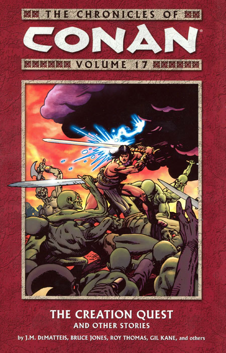 CHRONICLES OF CONAN VOLUME 17 Roy Thomas (W), J.M. DeMatteis (W), Bruce Jones (W), Gil Kane (A), and Ernie Chan (A). The incomparable Gil Kane (Green Lantern, Amazing Spider-Man, Blackmark) is featured in this special 240-page Chronicles of Conan volume-our thickest offering yet! Joining storyteller J.M. DeMatteis on Conan the Barbarian #127, Gil Kane's short but stellar Conan run in 1981 and 1982 thrust readers into a new era of magical quests, strange creatures, and inventive fantasy adventures. In Chronicles of Conan: The Creation Quest and Other Stories, Kane collaborates with DeMatteis, Bruce Jones, and longtime colleague Roy Thomas. In addition to a DeMatteis introduction-an engaging, behind-the-scenes look at his years working on Conan-Roy Thomas provides another insightful afterword, as he discusses working with Gil Kane on their 38-page 'King of the Forgotten People!' collaboration. In addition to the 'Creation Quest' story arc, readers will enjoy the meticulously restored color pages found in 'The Ring of Rhax,' 'A Hitch in Time,' and the heartbreaking 'Snow Haired Woman of the Wastes'-where Robert E. Howard's mighty barbarian finds himself unraveling horrific mysteries and testing his thresholds of pain and mental fortitude! o Special 240-page Gil Kane collection! o Since rekindling the Conan franchise in 2004, Dark Horse has sold over 300,000 Conan graphic novels! Chronicles of Conan 2008 Conan Properties International LLC ('CPI'). CONAN, CONAN THE BARBARIAN, THE SAVAGE SWORD OF CONAN, HYBORIA, and related logos, characters, names, and distinctive likenesses thereof are trademarks or registered trademarks of CPI, excluding RED SONJA which is a trademark or registered trademark of Red Sonja LLC. All rights reserved. FC, 240 pages TPB, 7' x 10'.