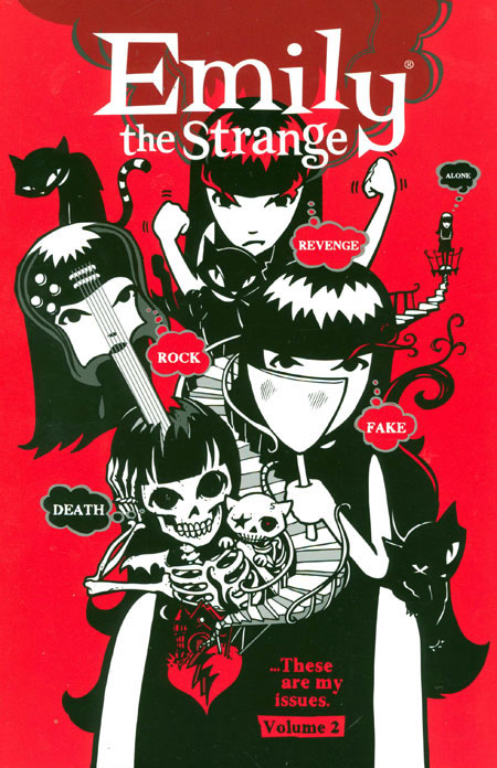 EMILY THE STRANGE VOLUME 2 Rob Reger (W), Jessica Gruner (W), Buzz Parker (A), and others. B&W&R, 240 pages TPB, 7' x 10' Whoever it was that told you not to talk to strangers needs to have a talk with Emily . . . Emily the Strange, that is. Emily knows that nothing is better than talking with strangers. In fact, the stranger the better! But that's Emily for you-she's the thirteen-year-old queen of the cultural underground, and she's too busy making up her own rules to follow anyone else's. That's how we've come up with so many insanely inspired ideas for the stories you'll find in Dark Horse's Emily the Strange Volume 2. This big, bizarre book collects the five most recent issues of Dark Horse's best-selling Emily the Strange comics, so you won't miss a single strange moment from the Rock issue, the Death issue, the Fake issue, the Revenge issue, or the Alone issue! We've all got issues, man. Isn't it time you dealt with at least these five? o Includes strange celebrity interviews with rocker Marilyn Manson, Gerard Way of My Chemical Romance, and more! o An Emily the Strange feature film is in the works with Dark Horse Entertainment producing! o Collects issues #1-#5.