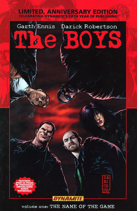 DYNAMITE ENTERTAINMENT is proud to welcome Gath Ennis and Darick Robertson's The Boys as they present a special anniversary hardcover collected edition of the comic book series everyone is talking about! Collecting the first 6 issues of the controversial new series from PREACHER writer Garth Ennis and artist Darick Robertson (TRANSMETROPOLITAN)! Don't miss this dark, twisted look at SUPERPOWERS, super - people, and the men and women who make sure the world's 'heroes' never go too far. Also features an introuction from writer, actor and producer Simon Pegg, the creator and star of Shaun of the Dead, Spaced and the upcoming Hot Fuzz! Recommended for Mature Readers