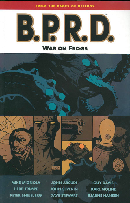 Mike Mignola (W), John Arcudi (W), Guy Davis (A), Karl Moline (P), Peter Snejbjerg (A), and others. The Bureau for Paranormal Research and Defense's ongoing war against the frog monsters explodes in five short stories set before Roger's death in B.P.R.D.: The Black Flame. o Collects B.P.R.D.: War on Frogs #1-#4, 'Revival' from MySpace Dark Horse Presents #8-#9, and an original eight-page story by Guy Davis. o The covers of all new volumes of B.P.R.D. include the line 'From the pages of Hellboy' above the title. o Series writer John Arcudi and Hellboy creator Mike Mignola join up with an incredible team of artists: John Severin (Two-Fisted Tales), Karl Moline (Fray, Buffy the Vampire Slayer), Peter Snejbjerg (Starman, The Books of Magic), Herb Trimpe (The Incredible Hulk), and multiple Eisner Award-winning series artist Guy Davis! B.P.R.D.: King of Fear , War on Frogs 2010 Mike Mignola.