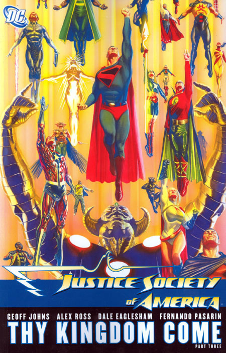 Written by GEOFF JOHNS, ALEX ROSS & PETER TOMASI Art by ALEX ROSS, DALE EAGLESHAM, FERNANDO PASARIN & NATHAN MASSENGILL Cover by ALEX ROSS Collecting JUSTICE SOCIETY OF AMERICA #19-22 and the JUSTICE SOCIETY: KINGDOM COME Specials MAGOG, SUPERMAN and THE KINGDOM, now in trade paperback! Picking up where PART TWO left off, The Justice Society begins to dissolve as Gog vows to bring peace to Earth in a way that frightens some and thrills others. Torn between Gog's desire to help the world and the moral cost it comes with, it's old guard vs. new as the line that was drawn is crossed.