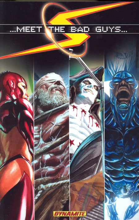 Dynamite invites you to 'Meet the Bad Guys!' -- a special series plotted by Alex Ross and scripted by Joe Casey and featuring four 'Dynamite' artists! As the heroes return, the villains rise! Featuring: The Green Lama vs. Bloodlust (issue #1 by Ross, Casey and Lau), The Fighting Yank vs. The Revolutionary (issue #2 by Ross, Casey and Lilly), The Mighty Samson vs. Dagon (issue #3 by Ross, Casey and Paul) and The Scarab vs. The supremacy (by Ross, Casey and Herbert)! All four issues ion one collection, featuring a complete cover gallery and bonus material!