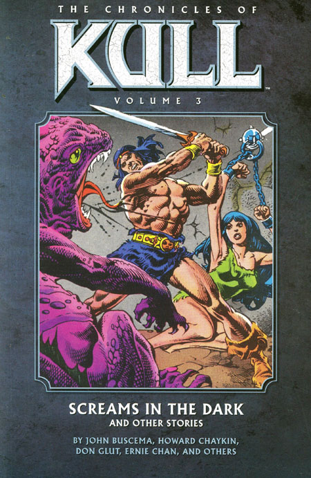 THE CHRONICLES OF KULL VOLUME 3: SCREAMS IN THE DARK AND OTHER STORIES Roy Thomas (W), Don Glut (W), Steve Englehart (W), John Buscema (A), Ernie Chan (A), and Howard Chaykin (A) FC, 216 pages TPB, 7' x 10' The Chronicles of Kull Volume 3 collects the last nine exciting Kull the Destroyer comics, tying up all of the loose ends from the previous two volumes and culminating in the most important fight of the former Valusian king's life-the battle for the Topaz throne and his former crown! Kull will need the help of an enigmatic warrior woman, Laralei, and an unlikely ally in arms, Ridondo the minstrel, if he is to conquer a giant extradimensional creature, three scheming wizards, and the wizard's skull-headed master and again rule the Purple Kingdom! o Volume 3 reprints Kull the Destroyer #21-#29, the short story 'The Mirrors of Tuzun Thune' from Conan the Barbarian #25, Conan the Barbarian #68, 'Beast from the Abyss' from Conan Annual #3, and a special cover gallery.