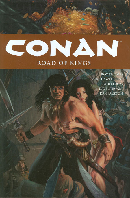 Roy Thomas (W), Mike Hawthorne (P), John Lucas (I), Jason Gorder (I), Dave Stewart (C), Dan Jackson (C), and Doug Wheatley (Cover) The journey down the legendary Road of Kings is no walk in the park. Being a skilled fighter will only get you so far; you'll also need plenty of gold to keep you going. Luckily, Conan and his companions are skilled at separating the wealthy from their spare treasure! But they'll have to brave monsters, pursuing guards, and the sword-handed Gamesh if they're to reach their final destination. Collects Conan: Road of Kings #1-#6.