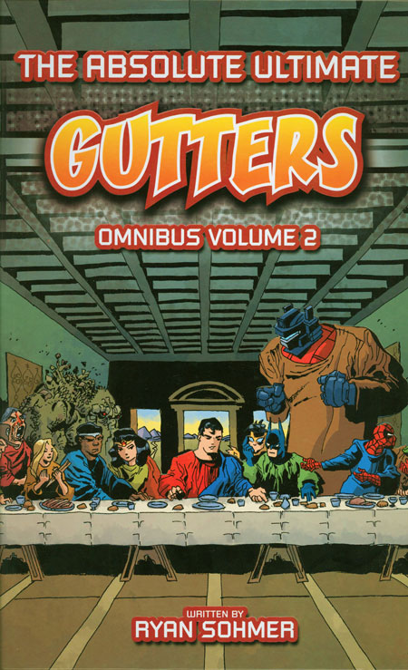 The Absolute Ultimate Gutters Omnibus Volume 2 is the sophomore collection of the wildly popular Gutters comic. Written by Ryan Sohmer (Least I Could Do, Looking For Group), Gutters is a series of standalone pages that parody the comic book industry and the heroes and characters that dwell within. Each page is penciled, inked and colored by a different artist, varying from the industry veteran to the newcomer. Volume 2 is an over-sized full color (and glossy) printed book. With a cover by Tim Sale (Batman, Deathblow, Grendel) and a forward by Chuck Dixon (Batman, Conan, Detective Comics).