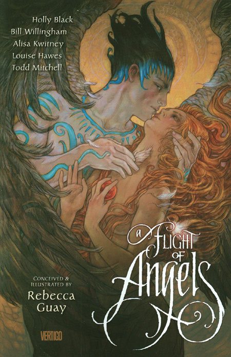 ANGELS: Guardians. Messengers. Warriors. Fallen. All these angelic aspects and more are explored in A FLIGHT OF ANGELS, a riveting tale in the tradition of The Decameron and The Canterbury Tales. A mysterious angel plummets to Earth and lands deep in a dark forest, where his dying body is found by the mystical denizens of this strange place. As the gathered fauns, fairies, hags and hobgoblins debate what to do with him, each tells a different story of who they imagine this celestial creature to be: a hero, a lover, a protector or a killer. Once the stories have been told, a verdict is rendered - and the outcome will leave you breathless. Conceived and stunningly illustrated by fantasy art legend Rebecca Guay (Magic: The Gathering, Veils), A FLIGHT OF ANGELS is written by an all-star lineup of today's top fantasy talent, including Bill Willingham (FABLES) and Holly Black (The Spiderwick Chronicles) in tales that will grip your heart and make your imagination soar.