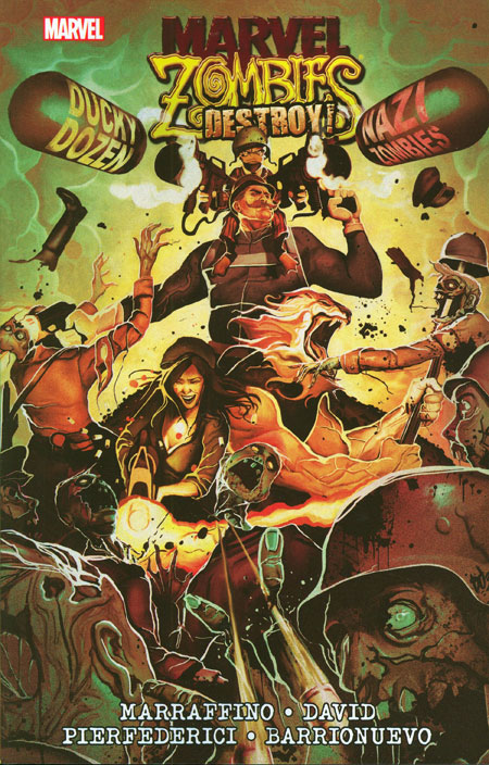 This is an advance order item. A horror from another world! In an alternate dimension in which the Third Reich won World War II by becoming the unstoppable undead, the Nazi regime plans to invade and conquer - and consume - the Marvel Universe! When government agency A.R.M.O.R. (Alternate Reality Monitoring and Operational Response) calls on the misanthropic mallard Howard the Duck to assemble a team to stop the undead Nazis, he musters a brigade of Marvel's misfits and enlists WWII veteran Dum Dum Dugan to lead them into interdimensional battle! They'll take on zombified versions of the Invaders, Thor and the Asgardians and even one of their own as they attempt to stem the tide of invincible flesh-eating monsters dead set on devouring their world! Collecting MARVEL ZOMBIES DESTROY! #1-5.