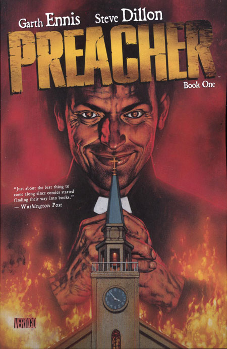 PREACHER #1-12-plus pinups from PREACHER #50 and #66-are collected in this new paperback that introduces Preacher Jesse Custer, Cassidy and Tulip. Disillusioned with his own beliefs, Custer begins a violent and riotous journey across the country in search of God, who has abandoned heaven.