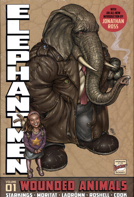 Story RICHARD STARKINGS with JOE CASEY & JOE KELLY art LADRONN, MORITAT, HENRY FLINT, TOM SCIOLI, DAVE HINE & CHRIS BACHALO cover BOO COOK The sold out first hardcover volume of ELEPHANTMEN is back in print and now includes the sold out ZERO issue with art by LADRONN, as well as a sketchbook section, the English & Media Studies back matter from the single issues, and an introduction by JONATHAN ROSS! Collects ELEPHANTMEN 0-7