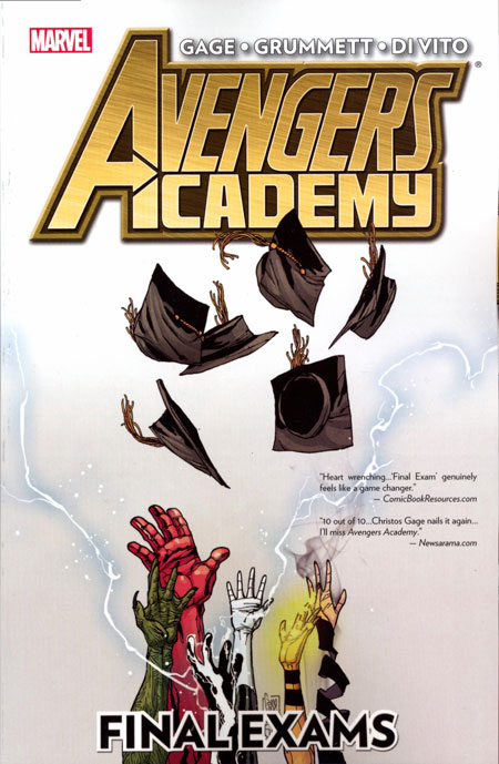 With the Academy shut down as the staff joins the fight between the Avengers and X-Men, the students are left to pave their own road and face the ultimate temptation. When the team learns of teenaged corporate magnate Jeremy Briggs' plan to cleanse the world of super heroes with a depowering inoculation, will they join his cause and take his 'cure'? When faced with the opportunity to live as ordinary teenagers, it's every student for himself as they make the biggest decision of their lives! Up against an unthinkable test, will they make the grade in this thrilling conclusion to the Avengers Academy saga? Collecting AVENGERS ACADEMY #34-39.