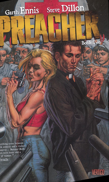 In this new trade paperback collecting PREACHER #13-26, Jesse Custer, his girlfriend Tulip and their vampire friend Cassidy head west to a party of Babylonian proportions. Then Jesse flies to France to rescue Cassidy from the clutches of religious fanatics. His search leads him into battle against the forces of the mysterious organization known as The Grail.