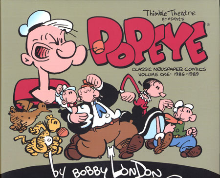 This is an advance order item. Famed Dirty Duck and Air Pirates cartoonist Bobby London's more than six-year run on the Popeye newspaper strip has been hailed both as a unique original creation and as an homage to Elzie Segar's larger Thimble Theatre vision. 'Segar was the seminal influence in my career,' the cartoonist said. London updated the strip to reflect current pop culture and also brought back the extended story format favored by Segar. London gives us new yet familiar versions of Popeye, Olive Oyl, Swee' Pea, and Wimpy, as well as Popeye's Pappy, Olive's brother Castor, Eugene the Jeep, Bernice the Whiffle Hen, the menacing Sea Hag, Alice the Goon, and more!