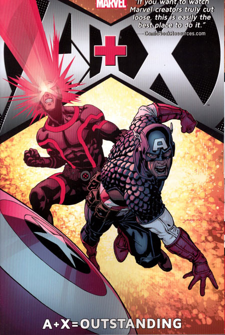 This is an advance order item. Your order is due by February 27 for this product. A+X shakes things up with its first book-length story as Captain America and Cyclops find themselves on a collision course! Cap is hell-bent on arresting the fugitive Cyclops, but that's only half of this duo's troubles. They also need to defeat a horde of menacing Skrulls and find Professor X's former students, the Skrull mutants known as Cadre K! But there's more! Emma Frost and Black Widow team up in a steamy saga! Magneto encounters the Superior Spider-Man! Dr. Strange and Beast face a truly insane threat! A heartbreaking story from the past of Spider-Man and Psylocke! Iron Man teams with fan-favorite X-student Broo! And Brian Michael Bendis pens a very special A+X tale! Featuring the Marvel writing debut of Max Bemis of the band Say Anything and Jeff Loveness, Emmy-nominated writer for Jimmy Kimmel Live! Collecting A+X #13-18.