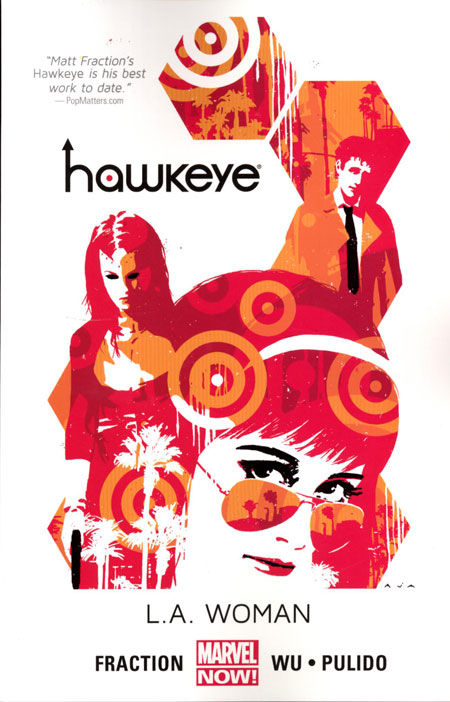 Kate Bishop heads to Los Angeles to get away from New York, life and Clint Barton - but she can't escape trouble! Because Madame Masque is hanging out poolside with the rich and famous, as well! As Kate helps a reclusive and sixties-damaged pop-music genius find his lost masterpiece, Madame Masque finds Kate. By which we mean starts trying to kill her again. This one has it all! Characters! Plot! Story! Dialogue! Theme! Meaning! Message! Action! A little exposition! Fire! Arrows! Criminals! Neighbors! Large bodies of water! Clients! Cops who don't care! A system that victimizes the victims! The dog! In a broken town where cynicism and apathy has its claws around the throat of the good and decent, Lady Hawkguy is the only hero you can trust! Collecting HAWKEYE (2012) #14, #16, 18, #20 and ANNUAL #1.
