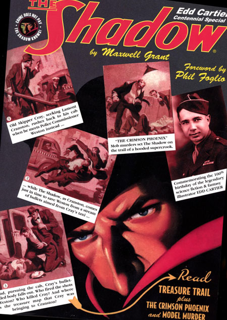 Sanctum Books commemorates the 100th birthday of acclaimed science fiction/fantasy illustrator Edd Cartier in its biggest volume ever, with tales by each of The Shadow's three Maxwell Grants! First, the Knight of Darkness follows an old sea captain's 'Treasure Trail' on a deadly path to uncover the sunken wealth from a Spanish galleon in a thriller by Walter B. Gibson! Then, 'The Crimson Phoenix' entangles The Shadow in a poisonous net of international intrigue in a Theodore Tinsley novel that foreshadowed Japan's surprise attack on Pearl Harbor. Finally, Lamont Cranston investigates a grisly 'Model Murder' in a tale by Bruce Elliott. Plus, a rare Edd Cartier classic from the Golden Age of Comics!