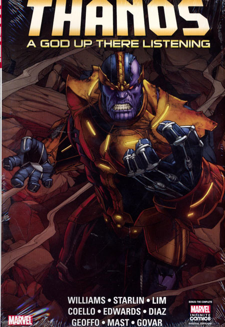 In the aftermath of INFINITY, Thane must come to terms with being the son of Thanos. But when he is offered a way to witness his father's black work firsthand, can he retain his humanity? Thane's determination to not follow in his father's diseased footsteps is put to the ultimate test as he flees from killers from across the galaxy - but what is the truth behind Thane's vision quest, and who has been leading him? Elsewhere, Thanos makes war on Ego the Living Planet, but Ego's retaliation is more terrible than Thanos bargained for. What, if anything, can torture the Mad Titan? Plus: Jim Starlin returns to the character he made famous as Thanos takes on Mephisto, the Avengers, his own future self and more! Collecting THANOS: A GOD UP THERE LISTENING INFINITE COMIC #1-6 and THANOS ANNUAL #1.