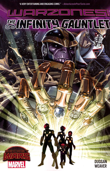 (W) Gerry Duggan, Dustin Weaver (A/CA) Dustin Weaver Anwen Bakian's family lives in a post-apocalyptic wasteland, scrounging for food and avoiding giant carnivorous bugs. Mom left years ago to join the Nova Force and never returned. So it's just Anwen, her dad, her sister and her grandpa. That is, until she finds a mysterious stone that holds incredible cosmic power - and the Mad Titan Thanos enters the picture! Now, the search for the Infinity Stones begins as the Bakian family finds themselves allied with Thanos. (Don't they know Thanos can't be trusted? No? Someone please tell them!) The search soon explodes into all-out war, and the fate of Battleworld hangs in the balance - but so does the fate of one family that has been torn apart. Don't miss this incredible tale that sets up the cosmic Marvel Universe for years to come! Collecting INFINITY GAUNTLET (2015) #1-5. Rated T