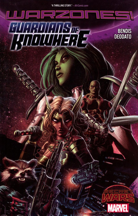 A single moon orbits Battleworld. But no, that's no moon. It's a space station. It's Knowhere! The head of a dead Celestial, somehow saved from the multiversal collapse. In this colony brimming with convicts and criminals, there's plenty of work maintaining the 'peace.' But a new power is rising that threatens to tear apart the threadbare fabric of the Celestial head's society. Will those destined to safeguard Knowhere accept that burden in time to save its citizens? Who is the mysterious woman that took out Gamora? Who stands to profit from Knowhere's turmoil? When Knowhere's secrets reveal themselves, it will change the face of the Guardians forever. The galaxy may be gone, but there are still places that need heroes. That need champions. That need Guardians. Collecting GUARDIANS OF KNOWHERE #1-4 and NEW AVENGERS: ILLUMINATI (2007) #3. Rated T