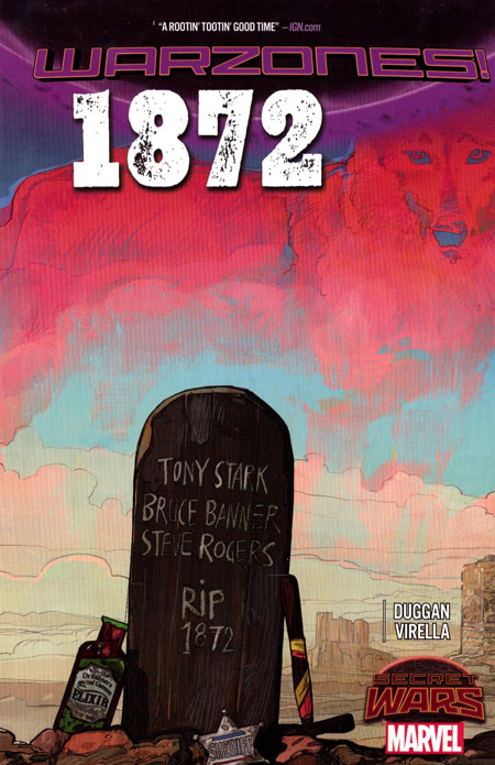 In the Battleworld zone of 1872, Sheriff Steve Rogers faces corruption and fear in the boom town of Timely. Can Anthony Stark pull Rogers' fat from the fire? Probably not, since the only thing he seems capable of pulling is a cork from a bottle. Things in Timely are bad, and getting worse - and when a stranger arrives in town, Timely will be changed forever. For anyone left standing when the dust clears, that is. It's a Dead Man's Hand composed of Bullseye, Elektra, Grizzly, Doc Ock and ringleader Wilson Fisk. But what concoction is the timid Dr. Banner cooking up in his apothecary? Will Justice stand tall at high noon, or die in the street? Plus: classic appearances of Will Talltrees, the Marvel Universe's modern Red Wolf! Collecting 1872 #1-4, AVENGERS (1963) #80 and material from MARVEL COMICS PRESENTS (1988) #170. Rated T+