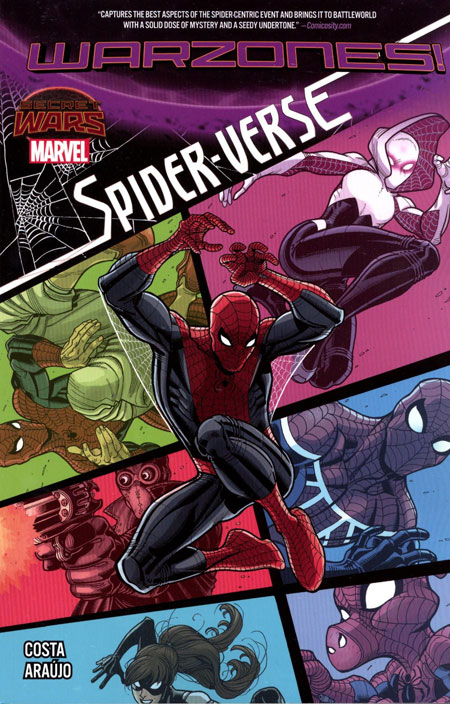 Spinning out of the blockbuster Spider-Verse event, a team of Spiders finds themselves face-to-face with Battleworld! Spider-Gwen, Spider-Man Noir, Spider-Man: India, Spider-Girl, Spider-UK and Spider-Ham are outmatched in a world where none of them belong - and face-to-face with Mayor Norman Osborn! This can't end well. Now, as Gwen Stacy explores her past and Spider-Man Noir goes on the run, the multiversal Spiders race against time - and Osborn - to discover exactly what force brought them all together! Could a possible key to victory be found in the porky paws of Spider-Ham? A new team of Web Warriors is formed as Battleworld gives up its secrets! Collecting SPIDER-VERSE (2015B) #1-5. Rated T