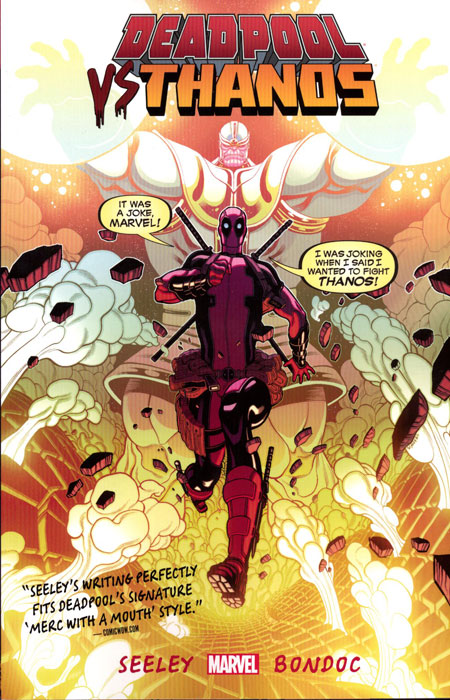 (W) Tim Seeley (A) Elmo Bondoc (CA) Tradd Moore It's the confrontation that every single Marvel comic has been building to: the Merc With a Mouth versus the Jerk With That Jaw! Deadpool goes to Infinity and beyond when he throws down the gauntlet against Thanos of Titan! These calamitous combatants are two sides of an unholy love triangle, with Death their fickle mistress. But when everything in the universe stops dying, could the bombshell with the killer cheekbones have her bony hands full with someone else?!? Who ever heard of a love square? How would that even work? The Mad Titan and the Crazy Cretin may just have to team up to find out what gives as they head 'From Her to Eternity!' Guest-starring Marvel's most popular and beloved character, the Black Talon - plus some nobodies called the Guardians of the Galaxy. Collecting DEADPOOL VS. THANOS #1-4. Parental Advisory
