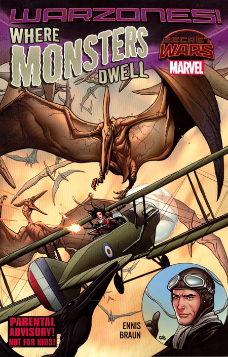 (W) Garth Ennis (A) Russell Braun (CA) Frank Cho Garth Ennis returns to Marvel! Fighter planes and dinosaurs collide in this raucous tale featuring the classic Marvel character Phantom Eagle! Ace pilot Karl Kauffman investigates the Valley of Flames, but soon finds himself in way over his head. This terrifying Battleworld domain is full of surprises, and Karl is only just scratching the surface. Between hungry dinosaurs, angry Amazonians and even crazier problems, Karl has never been in a tighter spot. The beautiful tribe of warriors who have taken him prisoner aren't very friendly at all, and these dinosaurs don't look domesticated. Karl aims to take to the skies once again, but can he beat the odds - and all the new enemies he's managed to make? Collecting WHERE MONSTERS DWELL (2015) #1-5. Parental Advisory