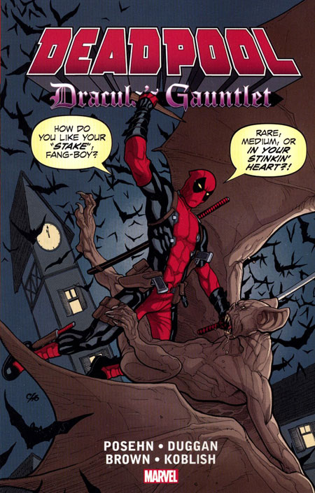 Dracula has chosen a bride. She's a succubus queen of the undead, and their union will end eons of conflict in the monster world. Only one problem: He's hired Deadpool to find her! The stakes are high, middling and painfully low as wascally Wade goes all Indiana Jones in a bid to dig up Drac's long-buried intended - battling teleporting assassins, Greek legends and even the vampire hunter Blade! And when Deadpool finally meets the bride-to-be, even he gets cold feet about this unholy matrimony. If Wade won't run this gauntlet, Dracula will throw down the gauntlet. And that means sending Werewolf by Night and the most literal Frightful Four of all time to retrieve his quarry. As an all-out Monster Mash looms, how far is Wade willing to go to stop this wedding? Collecting DEADPOOL: DRACULA'S GAUNTLET #1-7. Parental Advisory