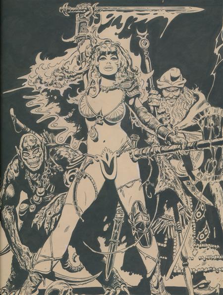 This huge art book presents the complete original artwork, in an archival format, of all of Frank Thorne's signature creations: Ghita, in her first full length adventure. This definitive first volume is 15 x 22 inches and is being printing on special archival paper that simulates the original Bristol board used by Thorne in the creation of this popular culture masterpiece. In 1978, fresh off his run on Red Sonja, Frank Thorne went on to create the lusty warrior-goddess, Ghita. Imbued with the spirit of a mighty general, she would lead a rag-tag band against bloodthirsty armies, and along the way get in some tumbumping. This initial volume showcases some of Frank's earliest art of Ghita including her first appearance in the erotic epic 'Ghita of Alizarr,' early character designs, unproduced movie storyboards, the Wizard and Warrior Women portfolio, pin-ups and covers. This oversized edition, measuring 15' x 22', presents Frank's artwork full size, as originally drawn. The artwork has been scanned from the original pages in color to ensure the closest reproduction. Special limited Edition with a special plate signed and numbered by Frank Thorne limited to 125 copies