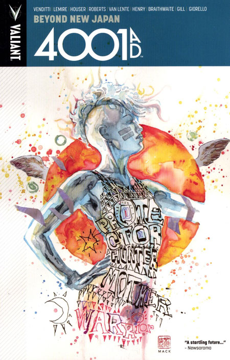(W) Jody Houser & Various (A) Doug Braithwaite & Various (CA) David Mack The most ambitious comics event of 2016 brings war to the 41st century - with Rai leading the charge! Rocketing out of the pages of 4001 A.D...the present and future of Valiant's greatest heroes come together in four essential standalone chapters at the heart of the blockbuster comics event of the year! Blast two thousand years into the future as the never-before-told history of New Japan's dominion over Earth and the future fates of X-O Manowar, Bloodshot and Shadowman stand revealed. Then, witness the battle- scarred debut of the boldest new hero of this century or the next when War Mother makes her history-shattering debut! The future starts now as all-star writers Robert Venditti, Jeff Lemire, Jody Houser, Rafer Roberts, and Fred Van Lente join visionary artists Clayton Henry, Doug Braithwaite, Robert Gill, and Tomas Giorello to bring the Valiant Universe barreling into the 41st century! New York Times best-selling writer Matt Kindt (DIVINITY II) and superstar artist Clayton Crain (X-Force) bring their startling vision of the year 4001 A.D. to new heights...with the fate of New Japan floating in the balance! Collecting 4001 A.D.: X-O MANOWAR #1, 4001 A.D.: BLOODSHOT #1, 4001 A.D.: SHADOWMAN #1, 4001 A.D.: WAR MOTHER #1.