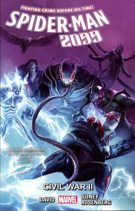 Miguel is back in 2099 - but it's a world he doesn't recognize. One that's altogether more…sinister. He wakes to find himself held captive by six villains. But how has his native timeline become so different from the one he left behind? Can Spidey escape his tormentors, find a way back to the past and fix the future? Or will the Sinister Six reign supreme in 2099? Meanwhile, Roberta Mendez, a.k.a. Captain America 2099, returns to her own time in a bid to find her family. But little does she know that the heroes of this era are being hunted in an all-out Civil War 2099! Will this be the end of tomorrow as we know it? Or can Spider-Man and friends find a way to set the timeline right? Collecting SPIDER-MAN 2099 (2015) #11-16. Rated T