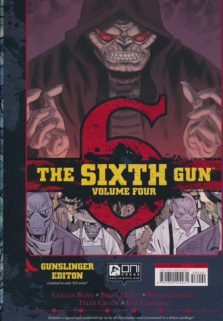 The Sixth Gun Volume Four Hardcover, collects issues 36 through 41, featuring the Not The Bullet, But The Fall story arc of the ongoing series by Cullen Bunn, Brian Hurtt, Tyler Crook, and Bill Crabtree, as well as the five issue spin-off mini-series Sons of the Gun with guest artist Brian Churilla. This oversized deluxe collection includes never before seen artwork, design sketches, cover galleries, an introduction by Usagi Yojimbo creator Stan Sakai, and more, from the Eisner-nominated fantasy western epic. Limited to only 500 units, this direct market exclusive Gunslinger edition also contains a signed tip-in with all the creators, and is presented in a deluxe slipcase and dust jacket featuring new original artwork.