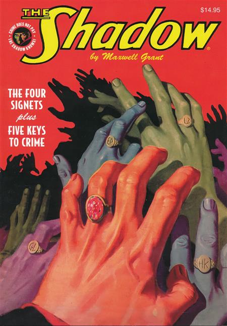 The Master of Darkness proves that 'crime does not pay' in two thrilling pulp novels by Walter B. Gibson. First, The Shadow knows that 'The Four Signets' hold a secret message that spreads crime and murder in their deadly wake! Then, the bequest of a rosewood music box leads to 'Five Keys of Crime' that can provide its young heir with a fabulous inheritance-if he lives long enough to collect it! Plus, a Hollywood star steals the picture when female sleuth Carrie Cashin investigates the mystery of 'The Three X's' in a tale by Theodore Tinsley.