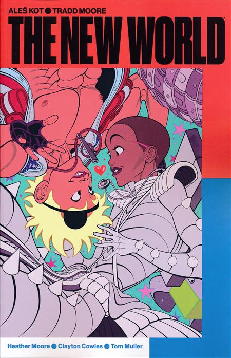 The United States of America-after the Second Civil War. Two people meet and fall in love. One, a very orderly vegan hacker ready to make some mess. The other, a chaotic cop with a reality TV show that never stops. With the entire Republic of New California after them, they run. A ballistic sci-fi action romance miniseries in the vein of Mad Max and Romeo and Juliet by ALEŠ KOT, TRADD MOORE, and HEATHER MOORE. Collects THE NEW WORLD #1-5