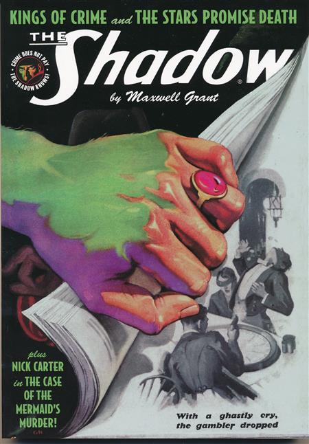 The Master of Darkness crushes crime in Seaview City in two thrilling pulp novels by Walter B. Gibson. First, while community leaders speed the growth of a great city, 'Kings of Crime' plot to fleece it out of millions Then, following a cryptic clue left by a dead man, The Shadow pursues a trail of astrological slayings when 'The Stars Promise Death.' Plus: Nick Carter solves 'The Case of the Mermaid's Murder!' in a Golden Age of Comics classic by Bob Powell.