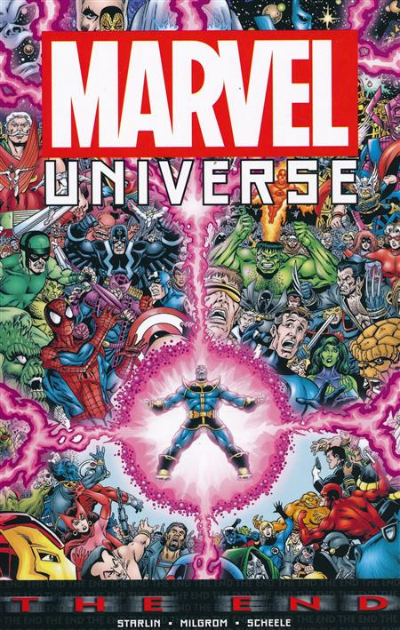 Renowned comic creator Jim Starlin tells the final tale of the Marvel Universe, bringing the entirety of creation to its startling climax! A grave threat from beyond space and time swiftly approaches the Earth - imperiling the very nature of the entire universe! This catastrophic, existence-ending event forces Earth's mightiest heroes and villains to join forces to fend off Armageddon. But amid ever-shifting alliances and internally warring factions, will they succeed in their quest to save all of eternity? Led by the demigod Thanos (who is admittedly not only quite mad, but something of a continual threat himself to both Earth and eternity), Earth's superhumans must stand shoulder-to-shoulder to face the most terrifying threat that they've ever encountered: Nothing less than the end of all that ever was! Collecting MARVEL UNIVERSE: THE END #1-6. Rated T+