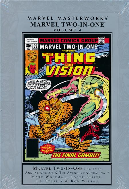 Our latest Masterworks offers you two heroes for the price of one! Yes, it's MARVEL TWO-IN-ONE, starring the world's most endearing pile of rocks, the Ever-Lovin' Blue-Eyed Thing! And his adventures begin - behind bars?! The Thing has been declared a public nuisance (and not just on Yancy Street), and it'll take the skills of both Matt Murdock and Daredevil to set him free! This marvelous Masterwork also features the debut of Project PEGASUS, the reality-bending Cosmic Cube, an army of android Visions, the Black Panther and Brother Voodoo vs. a zombie-vampire, Hercules, Captain Marvel - and a bruising Thing vs. Hulk battle! And it's all topped off with Jim Starlin's famous two-part cosmic epic pitting the Avengers and the Thing vs. Thanos and his Infinity Gems! Collecting MARVEL TWO-IN-ONE (1974) #37-46 and ANNUAL #2-3, and AVENGERS ANNUAL #7. Rated T
