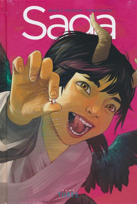 At long last, it's finally time for the THIRD massive hardcover collection of SAGA, the critically acclaimed sci-fi/fantasy series from the multiple Eisner Award-winning team of artist FIONA STAPLES and writer BRIAN K. VAUGHAN. Collecting 18 of the most shocking and impactful issue from the epic tale of Hazel and her star-crossed parents, this deluxe edition features a striking, all-new original cover from FIONA STAPLES, as well as exclusive, never-before-seen extras. Collects SAGA #37-54.