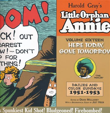 Annie might feel as if she's between a hammer and an anvil, but those are about the only menaces she avoids during the early 1950s! In less than two years of stories, the little orphan gets run over by a car, shot with a pistol, whacked with a bludgeon, firebombed in her bed, shoved in a gunny sack, caught in a tornado, flung overboard in a raging storm, and thrown alive into an underground cemetery vault. Meanwhile, 'Daddy' Warbucks, Punjab, and the Asp are a thousand miles away, with no clue to the whereabouts of America's spunkiest kid. 'Here Today, Gone Tomorrow' reprints all daily and color Sunday strips from October 29, 1951 through July 5, 1953. Included are five stories replete with greed and murder, atomic boats, blackmailers, poisoners, and deadly mutineers-yet also filled with good Samaritans and friendship from the most unexpected quarter, while also posing the question: can romance survive in a town called Futility? Advanced solicited for November.