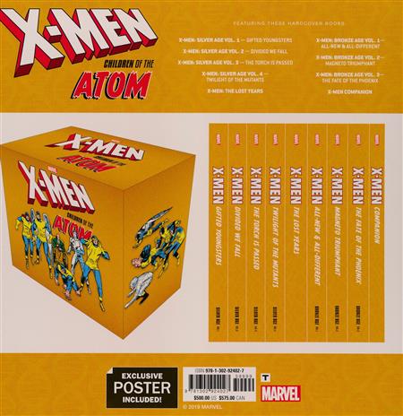 The X-Men's complete 1960s-1970s adventures - from their first clash with Magneto through the nightmarish Days of Future Past! Witness Professor X train the original X-Men - Cyclops, Marvel Girl, Beast, Angel and Iceman - to protect a world that hates and fears them! Meet classic foes, including the Brotherhood of Evil Mutants, the Juggernaut, the Sentinels and more - as well as new recruits Havok and Polaris! Then, the all-new, all-different X-Men arrive to change comics forever! Storm, Colossus, Nightcrawler, Banshee, Sunfire, Thunderbird and Wolverine propel the X-Men to greatness - even if not all of them survive the experience! Watch as Jean Grey is reborn as the Phoenix, the X-Men traverse the globe, Kitty Pryde debuts and mutantkind faces a frightful future as years of epic stories from an array of legendary creators are collected in one truly uncanny box set! Collecting: X-MEN: SILVER AGE VOL. 1 - GIFTED YOUNGSTERS PREMIERE HC (SLIPCASE EDITION) Collecting X-MEN (1963) #1-13, FANTASTIC FOUR (1961) #28 and ANNUAL #3 and material from TALES OF SUSPENSE (1959) #49, STRANGE TALES (1951) #120 and JOURNEY INTO MYSTERY (1952) #109. 400 PGS. X-MEN: SILVER AGE VOL. 2 - DIVIDED WE FALL PREMIERE HC (SLIPCASE EDITION) Collecting X-MEN (1963) #14-31. 384 PGS. X-MEN: SILVER AGE VOL. 3 - THE TORCH IS PASSED PREMIERE HC (SLIPCASE EDITION) Collecting X-MEN (1963) #32-48 and AVENGERS (1963) #53. 384 PGS. X-MEN: SILVER AGE VOL. 4 - TWILIGHT OF THE MUTANTS PREMIERE HC (SLIPCASE EDITION) Collecting X-MEN (1963) #49-66, KA-ZAR (1970) #2-3 and MARVEL TALES (1964) #30. 416 PGS. X-MEN: THE LOST YEARS PREMIERE HC (SLIPCASE EDITION) Collecting AMAZING SPIDER-MAN (1963) #92; INCREDIBLE HULK (1968) #150, #161, #172 and #180-181; AMAZING ADVENTURES (1970) #11-17; MARVEL TEAM-UP (1972) #4 and #23; AVENGERS (1963) #110-111; CAPTAIN AMERICA (1968) #172-175; DEFENDERS (1972) #15-16; and GIANT-SIZE FANTASTIC FOUR #4. 480 PGS. X-MEN: BRONZE AGE VOL. 1 - ALL-NEW & ALL-DIFFERENT PREMIERE HC (SLIPCASE EDITION) Collecting GIANT-SIZE X-MEN #1, X-MEN (1963) #94-108, AMAZING SPIDER-MAN (1963) #161-162, MARVEL TEAM-UP (1972) #53 and ANNUAL #1 and IRON FIST (1975) #15. 424 PGS. X-MEN: BRONZE AGE VOL. 2 - MAGNETO TRIUMPHANT PREMIERE HC (SLIPCASE EDITION) Collecting X-MEN (1963) #109-124, X-MEN ANNUAL (1970) #3, MARVEL TEAM-UP (1972) #69-70 and #89, INCREDIBLE HULK ANNUAL #7 and POWER MAN AND IRON FIST (1978) #57. 440 PGS. X-MEN: BRONZE AGE VOL. 3 - THE FATE OF THE PHOENIX PREMIERE HC (SLIPCASE EDITION) Collecting X-MEN (1963) #125-141, UNCANNY X-MEN (1981) #142-143, X-MEN ANNUAL (1970) #4, MARVEL TWO-IN-ONE (1974) #68 and material from MARVEL TREASURY EDITION #26-27 and MARVEL TEAM-UP (1972) #100. 472 PGS. X-MEN COMPANION PREMIERE HC (SLIPCASE EDITION) Collecting PHOENIX: THE UNTOLD STORY and material from F.O.O.M. #10 and NOT BRAND ECHH #4 and #8. 200 PGS. X-MEN: CHILDREN OF THE ATOM BOX SET SLIPCASE POSTER (SLIPCASE EDITION) Rated T