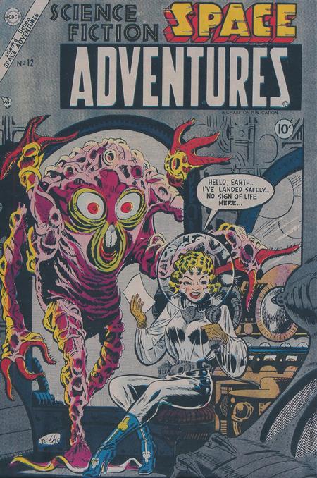 (A) Dick Giordano & Various Synopsis: CHARLTON - SPACE ADVENTURES (1952 Series) VOLUME 3 : ISSUES 11 - 15 May/June 1954 to March 1955 Special Notes: This third volume of CHARLTON 's fit 'n' funky SPACE ADVENTURES couldn't always make up its mind whether to go all-out-SF or all-out-Horror or-as is in evidence here-a mix of the two. And you know what, it works perfectly particularly with The Blue Beetle flashing his chops. Ideal fodder for fans of I Married A Monster From Outer Space and Dan Dare, plus Quatermas ('Who's that? Hey, Melvin! See me when school's out!'). Yessir, this baby near on demands that you dig out that old goldfish bowl and your holstered interstellar raygun. If you're quick, you can probably fight off several groups of marauding aliens before your mum calls you in for supper.