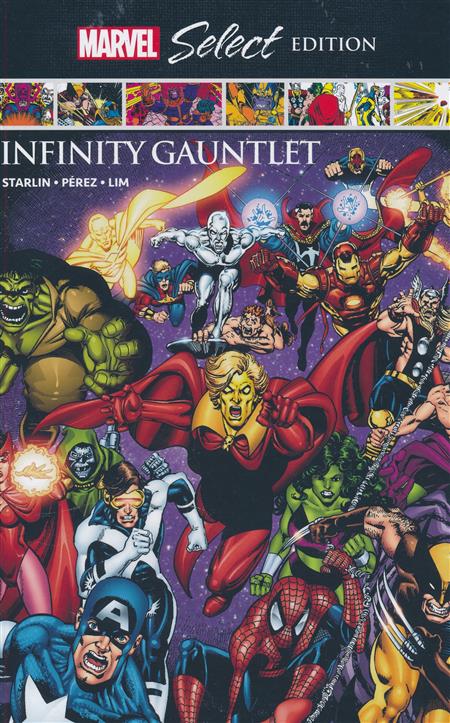 Continuing the series of graphic novels handpicked by Marvel Editorial to showcase pivotal storylines written and drawn by some of Marvel's most acclaimed creators! For the dark Titan, Thanos, the Infinity Gauntlet was the Holy Grail - the ultimate prize to be coveted above all else. With it came omnipotence: absolute control of all aspects of time, space, power, reality, the mind and the soul. But Thanos gaining supreme might meant the beginning of a dark nightmare for the entire universe. Now, on the edge of Armageddon and led by the mysterious Adam Warlock, Earth's heroes join in a desperate attempt to thwart this nihilistic god's insane plunge into galactic self-destruction. Should the heroes fail, the astral gods of the universe wait to step into the fray. But in such an awesome cosmic conflict, will anyone survive? It's one of the greatest blockbusters of all, from cosmics maestro Jim Starlin, the legendary George Pérez and fan-favorite Ron Lim! Collecting INFINITY GAUNTLET (1991) #1-6. Rated T+