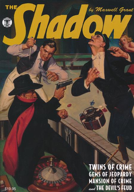 The Women of The Shadow are showcased in classic pulp novels by Walter B. Gibson and Theodore Tinsley writing as 'Maxwell Grant.' First, the pall of death falls over a 'Mansion of Crime.' Can the Master of Darkness penetrate the cloak of evil to save innocent lives? Next, a ten-million-dollar crime is brewing along the Atlantic Coast, and only The Shadow can prevent the theft of priceless 'Gems of Jeopardy.' Then, The Shadow seeks to unravel the sinister secret of 'Twins of Crime.' Finally, Lamont Cranston and Margo Lane's investigation of a five-year-old murder places them in the middle of 'The Devil's Feud.' This extra-length collectors special leads off with an action-packed cover by George Rozen (reproduced directly from the original painting) and also features classic pulp art by Graves Gladney and Paul Orban, with commentary by pulp historian Will Murray.